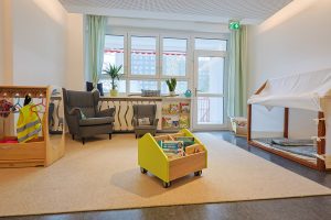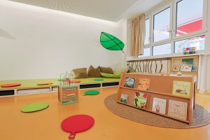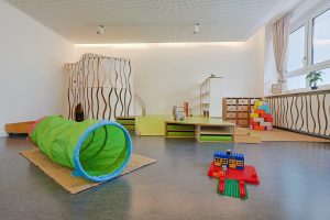 Die Kita glänzt durch gut geplante und anregungsreiche Raumgestaltung. Ein durchdachtes Lichtkonzept trägt dazu bei, Ecken aufzuhellen oder mit gedimmter oder farbiger Beleuchtung für gemütliche Stimmung zu sorgen. Ansprechende Spielecken sowie unterschiedliche Materialien und Spielzeuge fördern die Entwicklung der Kinder. In der neuen, hauseigenen Frischküche werden ausgewogene Mahlzeiten täglich frisch zubereitet. Umgeben wird das Gebäude von einem großen Garten, der zum Spielen, Toben und Erkunden einlädt.