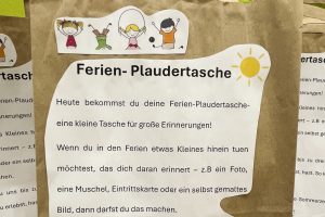 Ferien in Berlin, am Meer oder in den Bergen? Im INA.KINDER.GARTEN Bülowstraße haben die Kinder ihre Sommererlebnisse in „Plaudertaschen“ gepackt und nach den Ferien in die Kita mitgebracht. Dort wurde dann jeden Tag eine Tasche geöffnet und bestaunt: Urlaubsmitbringsel, kleine Schätze, tolle Geschichten, alles konnte drin sein. Auf einem großen Plakat wurden die Erinnerungen festgehalten. In den anschließenden Gesprächen wuchsen sprachliche Kompetenzen und die Freude am Erzählen.