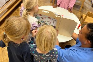 Im INA.KINDER.GARTEN Augustenburger Platz ist aus einer Sommerbeobachtung ein Sprachprojekt entstanden. Auszubildende Rahel bemerkte, wie gern die Kinder im Garten auf einer Decke lagen und vorgelesenen Büchern oder ausgedachten Geschichten lauschten. Sie hatte die Idee, dem einen anderen Rahmen zu geben – und gemeinsam eine eigene Geschichte für das Kamishibai-Theater zu erfinden. Bei dieser aus Japan stammenden Form des Vorlesens werden Geschichten mit Unterstützung von Bildkarten erzählt, die nacheinander in einen Holzrahmen gesteckt werden.