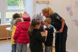 Anschließend drehte Frau Arndt den Spieß um und stellte im Atelier selbst einige Fragen: Wie funktioniert ein Zebrastreifen? Warum schaut man beim Überqueren der Straße zweimal nach links? Und wieso sollte der eigene Name besser nicht außen an der Schultasche stehen? Ein aufregender Vormittag voller Staunen, Lernen und echter Begegnung. 💬👮♀️