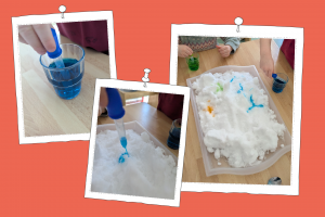 In den Kitas INA.KINDER.GARTEN Flurweg und INA.KINDER.GARTEN Finchleystraße wurde der viele frische Januarschnee für ein buntes Experiment genutzt: Die Kinder mischten Wasser mit Lebensmittelfarben, zogen diese in kleine Spritzen und malten damit bunte Figuren in die Flocken.